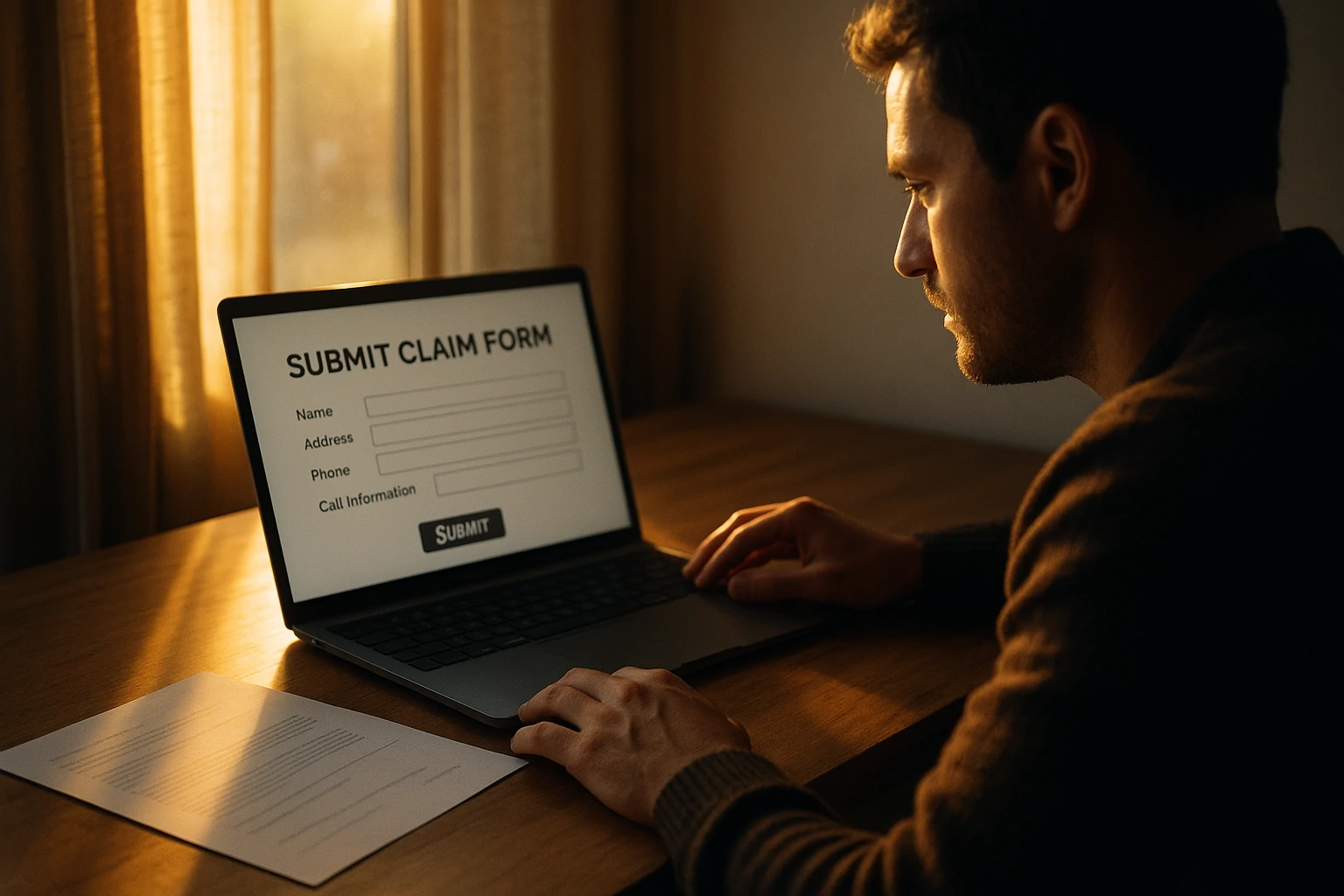 Man sitting at a wooden desk with a laptop, sunlight streaming in through window, filling out a class action claim form online.