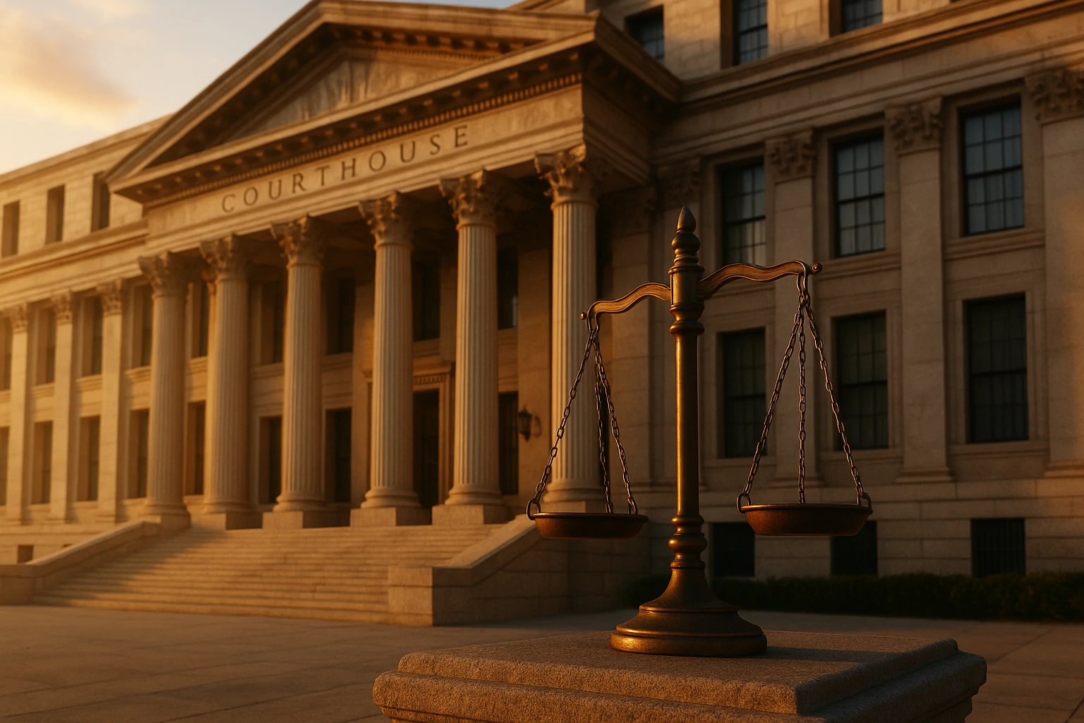 Cinematic court building in golden hour light with symbolic balance scales, showing class action lawsuit theme