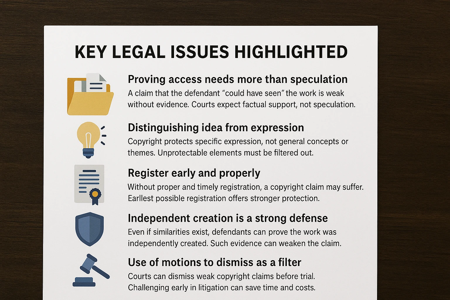 If you believe someone copied your work, do not launch a vague complaint. Build your case: show access (distribution, emails), highlight specific matching expressive elements, show registration, and differentiate your work.