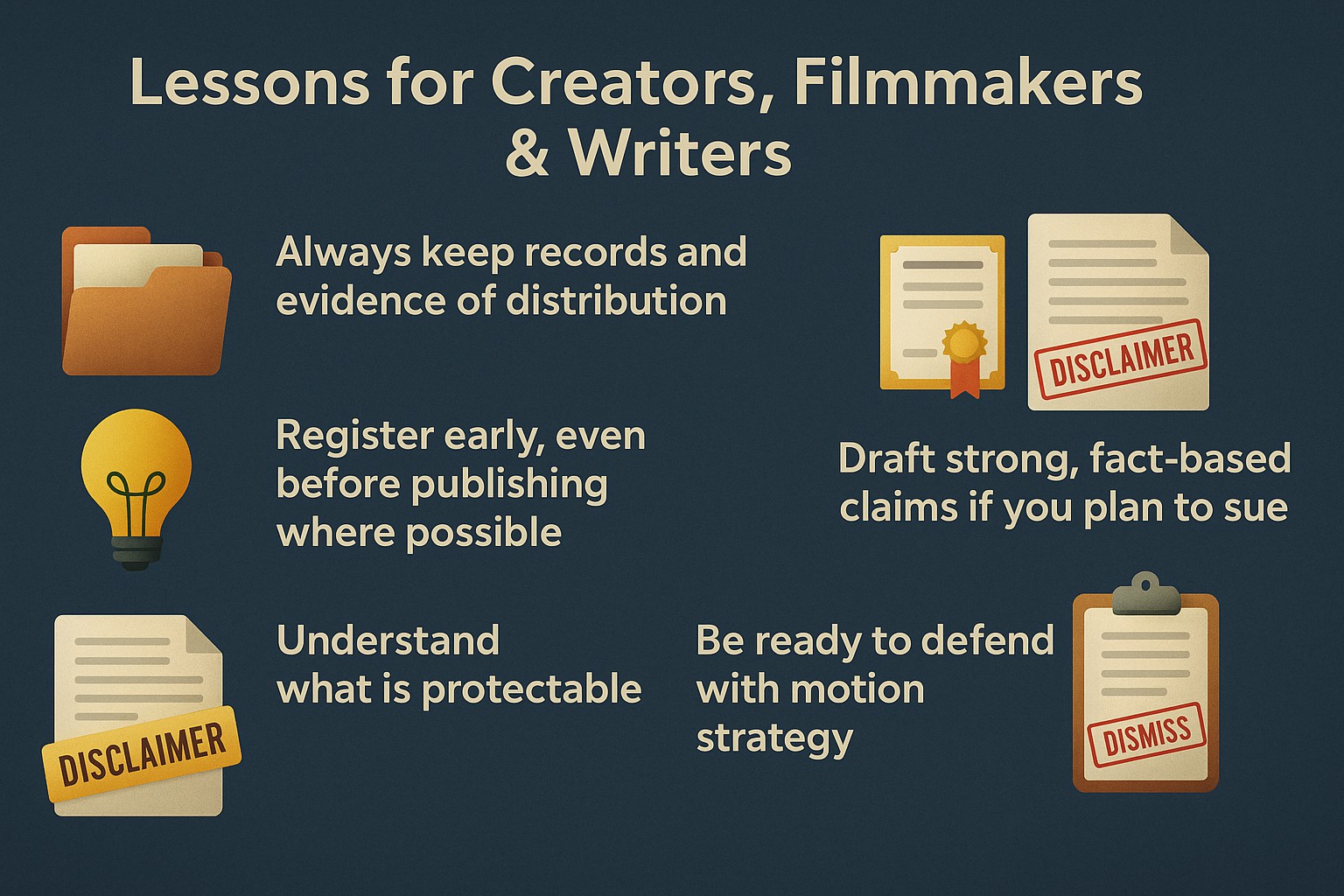 Creators, authors, and filmmakers should take note: document your work, register early, know your rights, and build strong claims if you sue. Weak claims will not survive motion practice.