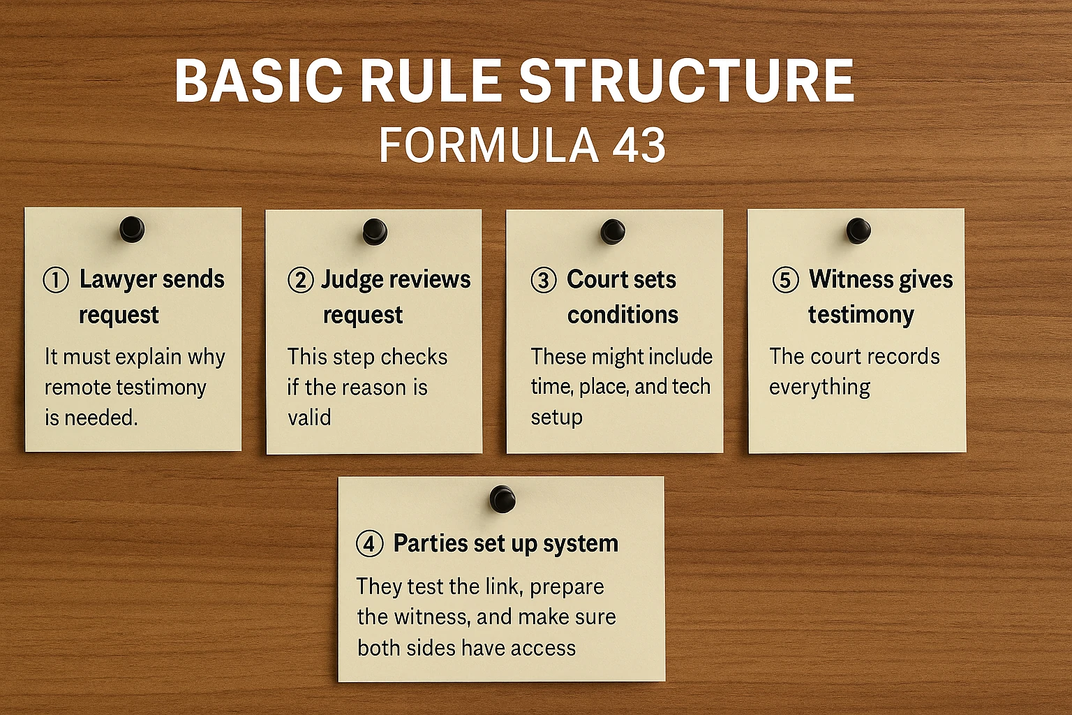 When can a court allow Formula 43 to apply? | Courts use Formula 43 when a witness faces travel limits, health risks, or safety threats. Judges approve it only if the process stays fair for both sides. |
