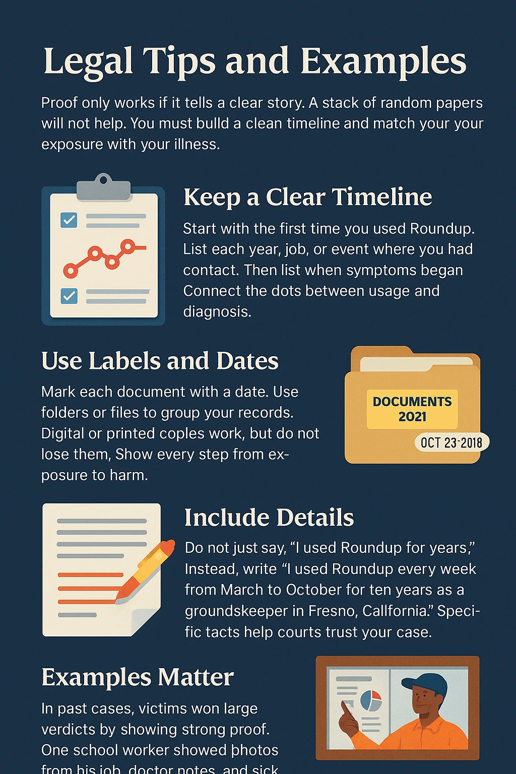 Courts want to see when you used Roundup, how often, and when symptoms began. Keep it clear. Write it down early.