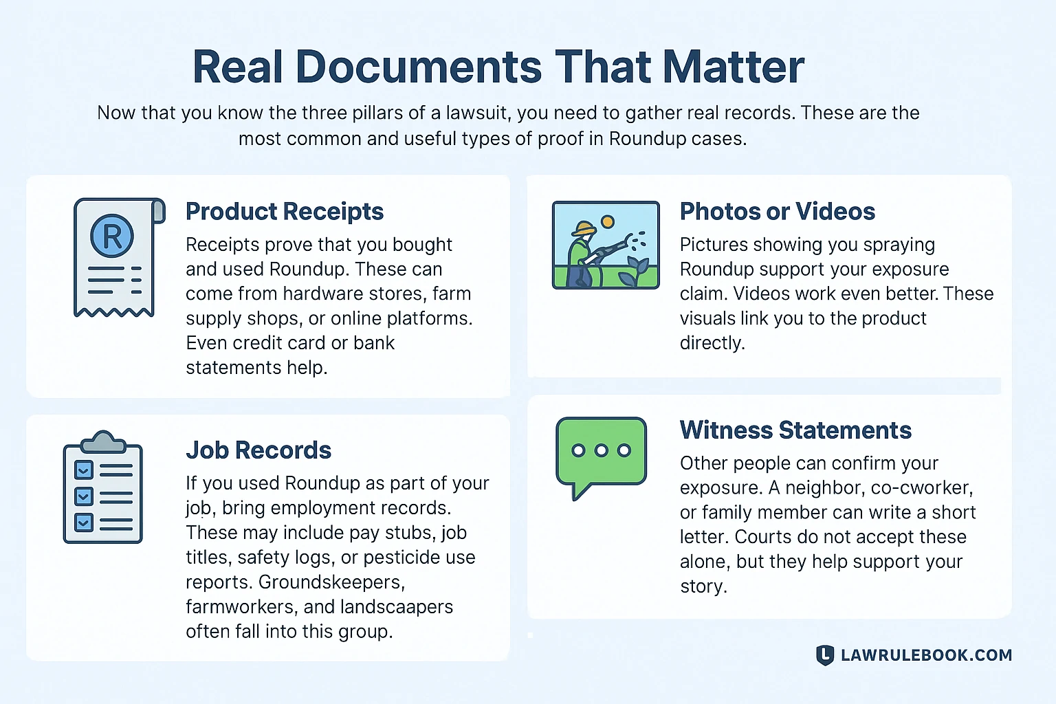 Now that you know the three pillars of a lawsuit, you need to gather real records. These are the most common and useful types of proof in Roundup cases.